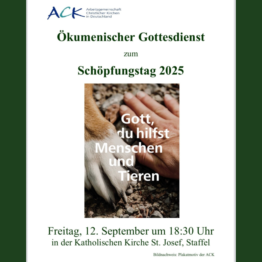 Der nächste ökumenischer Gottesdienst der Arbeitsgemeinschaft Christlicher Kirchen wird am Freitag, den 12. September um 18:30 Uhr in der katholischen Kirche St. Josef in Staffel gefeiert. Es ist ein Gottesdienst zum Tag der Schöpfung.