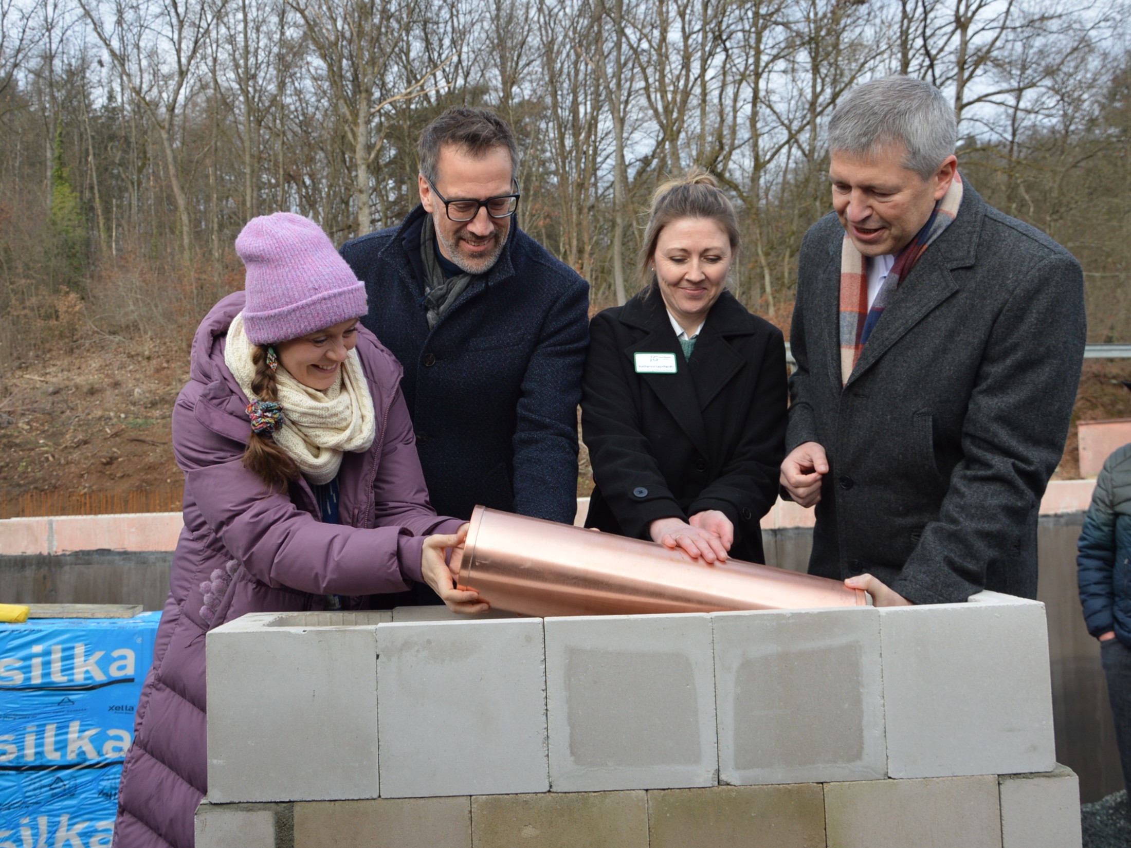 Nachdem die Grundsteinurkunde verlesen wurde, erläuterten Katharina Launhardt und Peter Bittermann die verschiedenen Gegenstände, welche als Zeugnisse der Gegenwart in eine kupferne Zeitkapsel gegeben wurden. Dies waren die Grundsteinurkunde, die tagesaktuelle Ausgabe der Dill-Zeitung, jeweils eine Ausgabe des Elisabeth-Kuriers, der JG-Publik und des aktuellen Pfarrbriefes, ein Satz der aktuellen Euro-Kursmünzen und die Baupläne des Architekten.